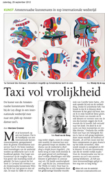 Artikel 'Taxi vol vrolijkheid' Over mijn serie van 6 ronde schilderijen: Carnival des Animaux - als sticker op E-Taxi in Amsterdam